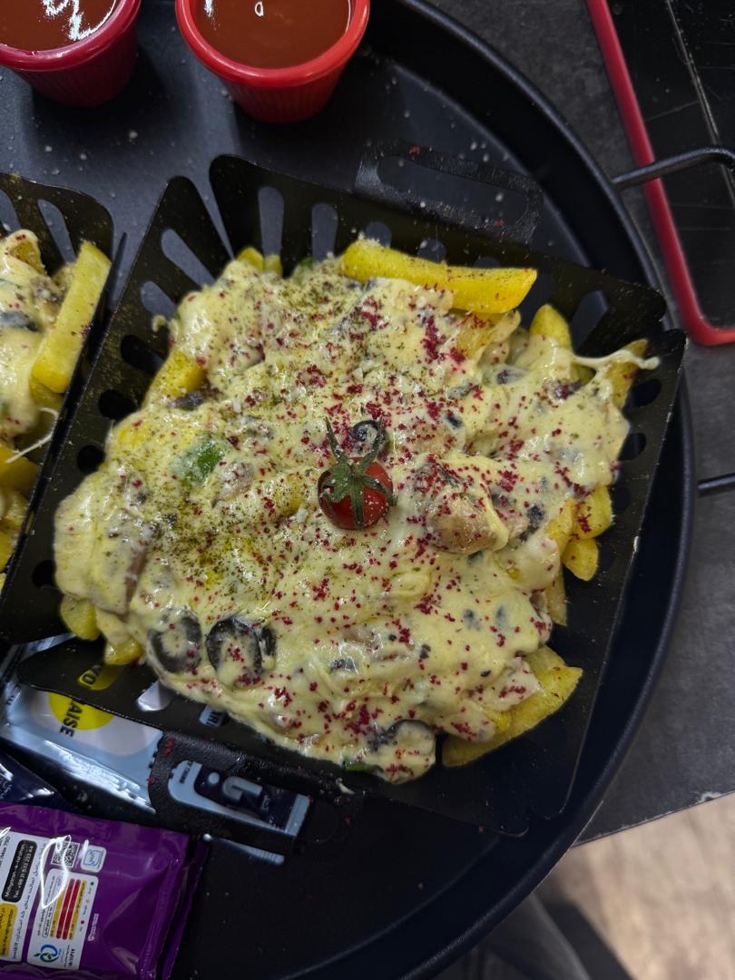 سیب زمینی سرخ شده به همراه ذرت و زیتون و کالباس و پنیر..