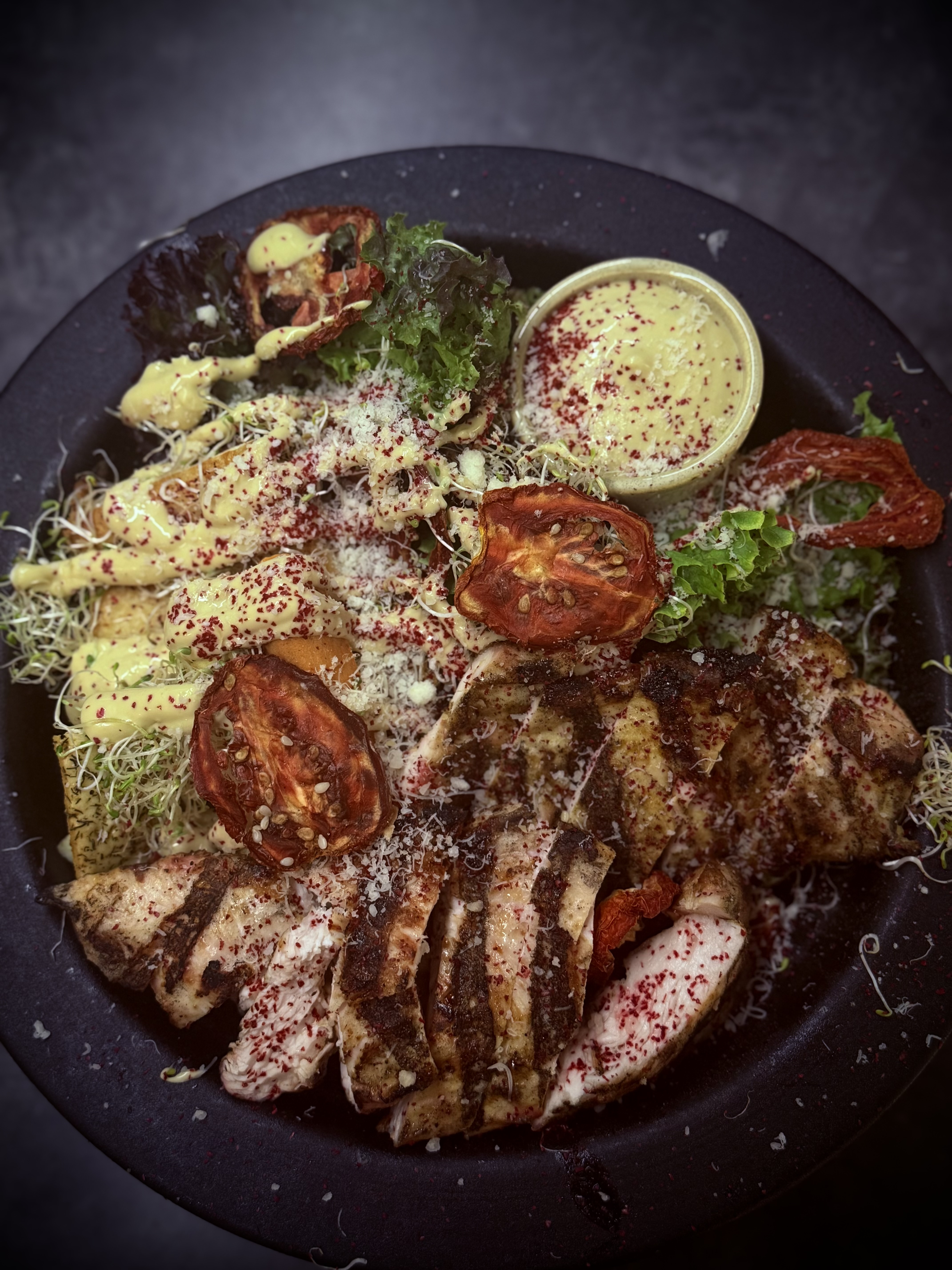خمیر پیتزا ایتالیایی، سینه مرغ تکه ای طعم دار شده گریل، قارچ، زیتون، فلفل دلمه، پنیر پیتزا، سس مخصوص، سیب زمینی سوخاری